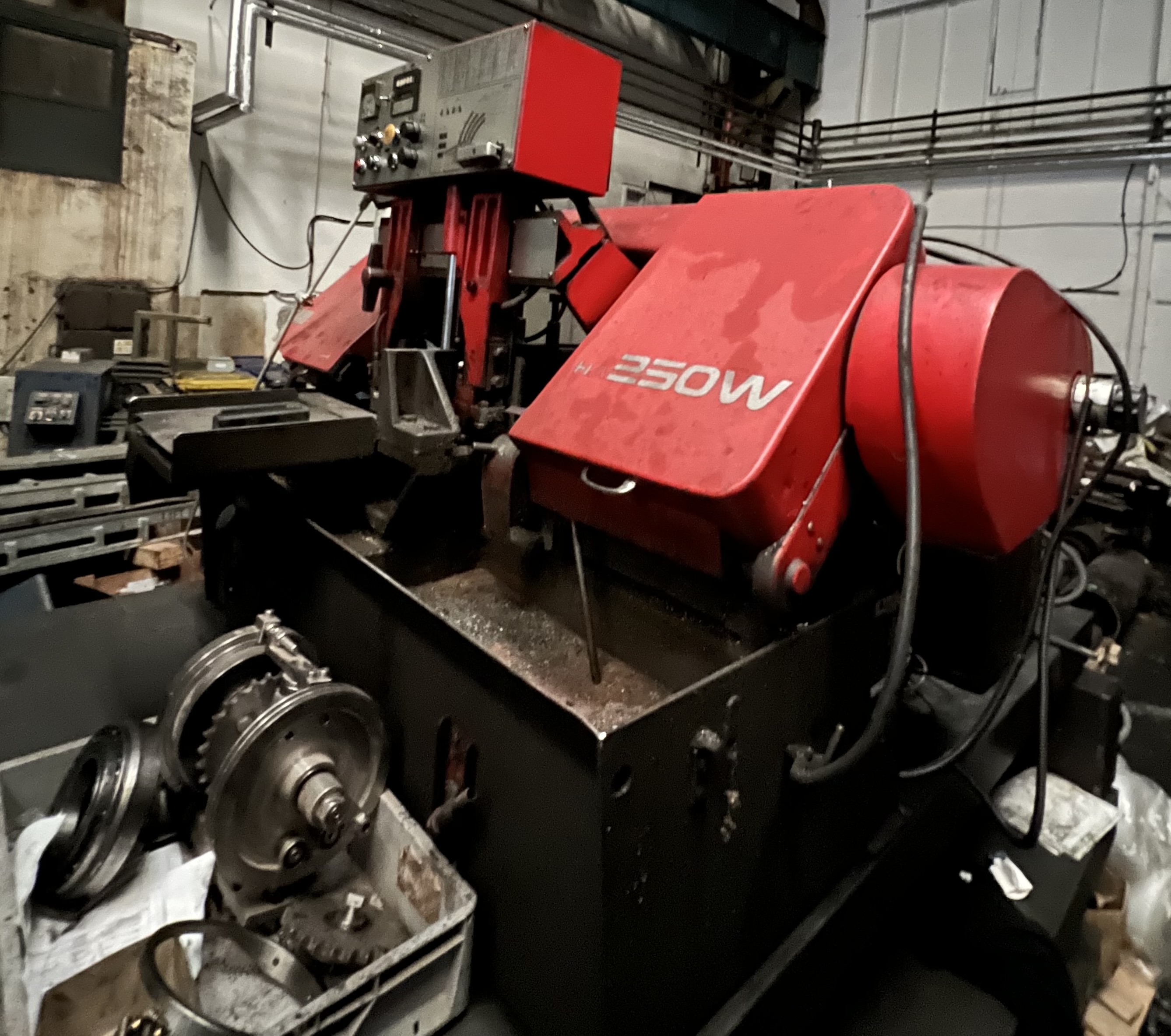2 x Band saw Type: HA 250 W Manufacturer: Amada Year: 1991 Saw blade: Dimensions: 32 × 0.95 × 3505 mm Blade speed: 20 – 80 m/min (50 Hz) 24 – 80 m/min (60 Hz) Cutting capacity: Round material: Ø 250 mm Rectangle: 300 × 250 mm Saw motor: 3.7 kW Hydraulic pump: 0.75 kW Coolant pump: 0.18 kW Power consumption: 6.9 kVA Stroke length: 400 mm Worktable height: 700 mm Maximum workpiece weight: 1500 kg Machine weight: 1200 kg Both machines in good condition, fully functional Find more here - / Contact us at -