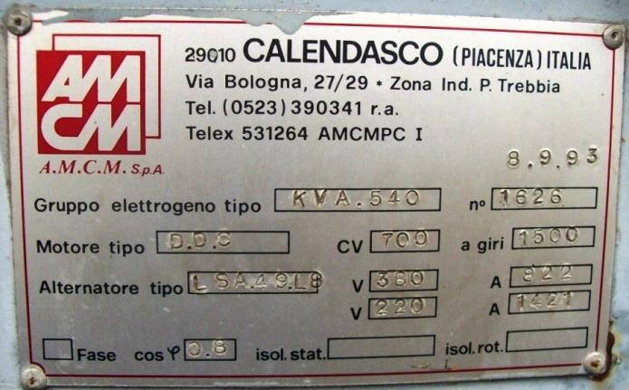MAKE:DETROIT TIPO:12V92 SEGNO STAMP: 12VF 08130 8123-7405 9.93 Alternatore MAKE:LEROY FOMER TIPO:M49L8 N.:AH052944/01 KW:436 KVA:540 AMP:828 U:50 V:380 Giri/min:1500 DATA:Ago-93