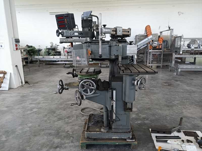 Alesatrice/fresatrice HAUSER 3DR Max. distanza percorsa asse X: 400 mm Max. distanza percorsa asse: 200 mm Max. distanza percorsa asse Z: 400 mm Mandrino: 2 velocità Cono:CM2 Uscita mandrino: 120 mm 2 gamme di velocità 60-1500 RPM / 1500-3000 RPM Dimensioni della tavola: L 590 mm x L 320 mm Variatore di velocità al mandrino 2 anticipi Discesa automatica: 0,03 mm/min - 0,06 mm/min Asse X funzionale con ideazione Mitutoyo Asse Y e Z: scala difettosa Tensione: 380 V Larghezza: 1500 mm Profondità: 1700 mm Altezza in posizione bassa: 1800 mm Peso: circa 1,5 T