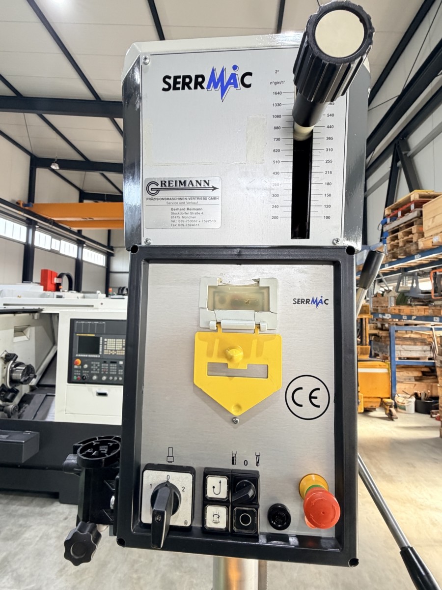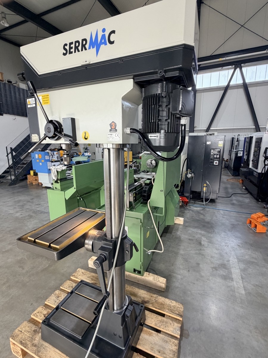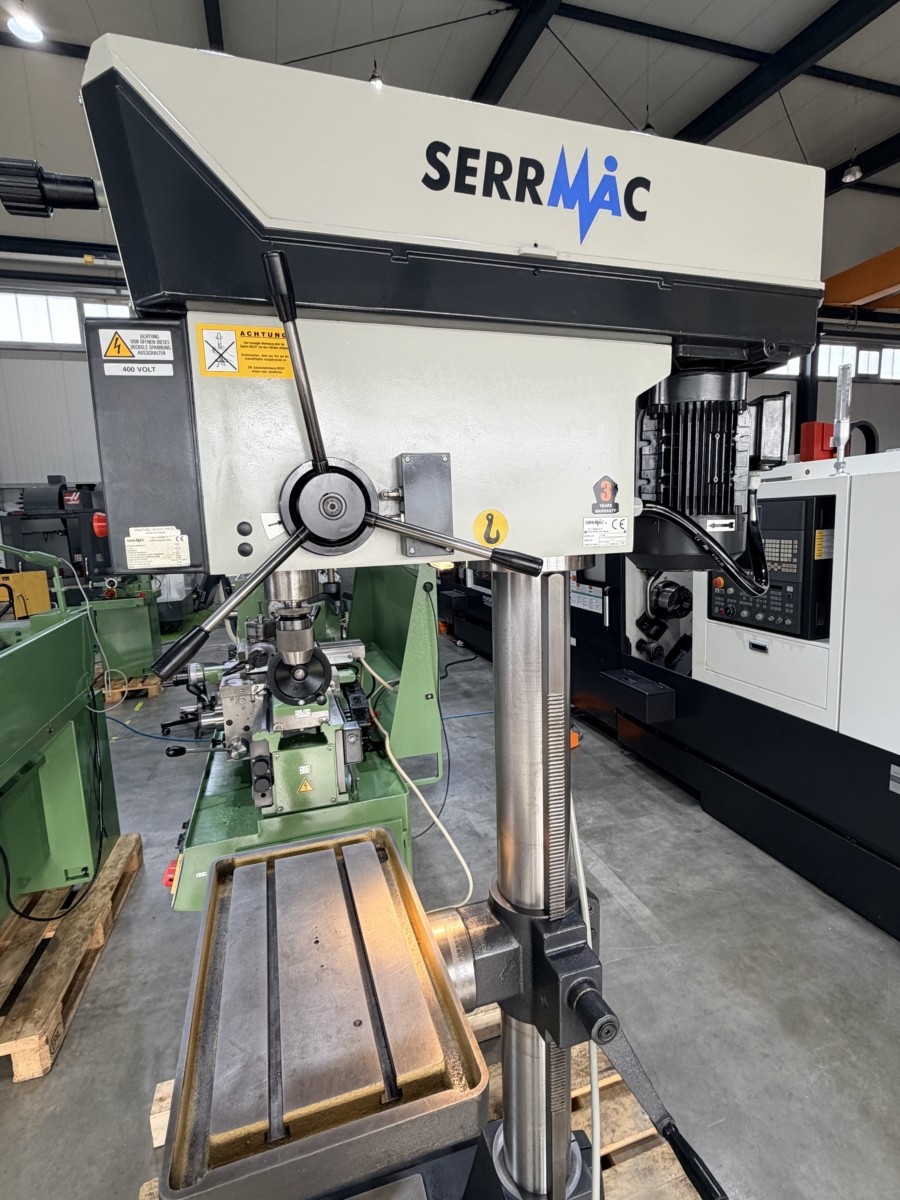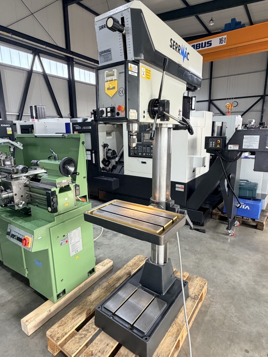 Trapano SerrMac TCO 28 Produttore: SerrMac (Italia) Anno di fabbricazione: 2002 Tipo di macchina: trapano a colonna / trapano da banco Diametro di foratura (max.): 28 mm Profondità di foratura: 150 mm Sporgenza: 300 mm Attacco mandrino: Cono Morse MK3 Gamme di velocità: 205–325–1050 / 410–650–2100 giri/min (tramite trasmissione a cinghia, 2 marce) Dimensioni del tavolo: circa 500 mm di lunghezza Costruzione: costruzione in ghisa solida Azionamento: Trasmissione a cinghia con controllo manuale dell'avanzamento