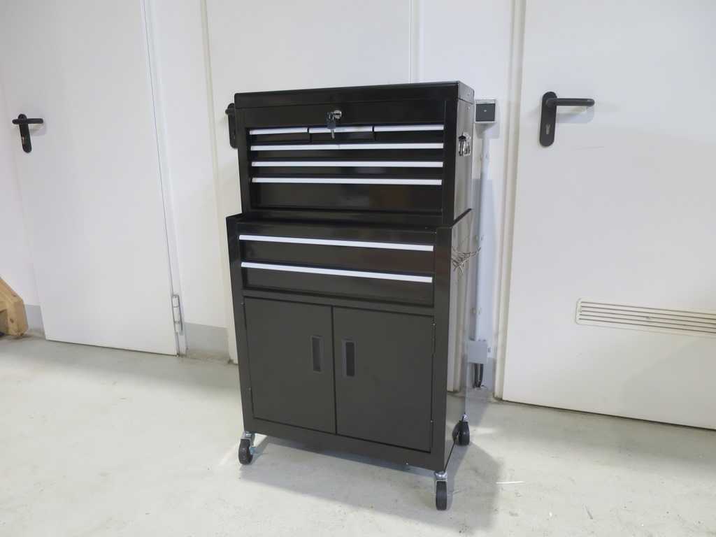 Carrello attrezzi incluso il top box rimovibile. Cassetti a cuscinetti a sfera (doppio deposito) Matterini antiscivolo in ogni scompartimento. 2 aste d'acciaio per bloccare la scatola superiore. Tutti i cassetti possono essere aperti al 100%. Manici pieni, 4 ruote da 70 mm, 2 chiavi inglesi. Numero cassetti: 8 pezzi. Peso netto 27 kg Dimensioni L-W-H 700 x 400 x 750 mm Condizione: mai usata / nuova (5) Auction-ID: A1-45681-766
