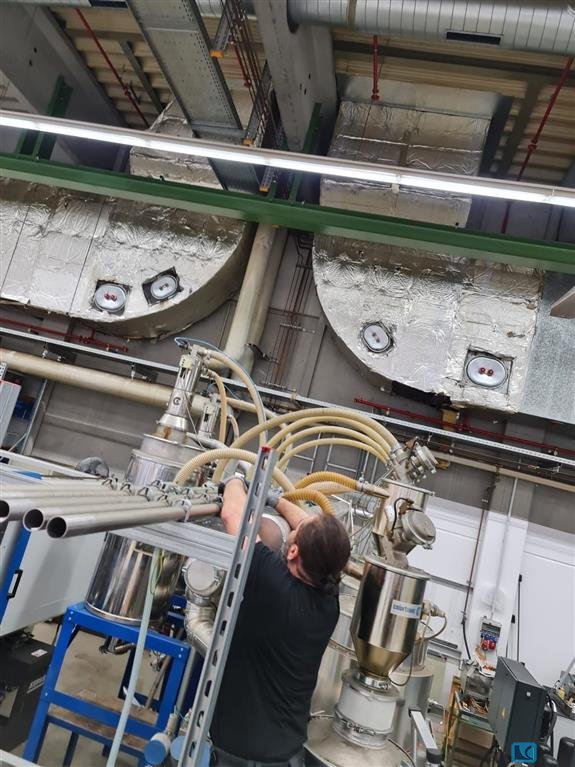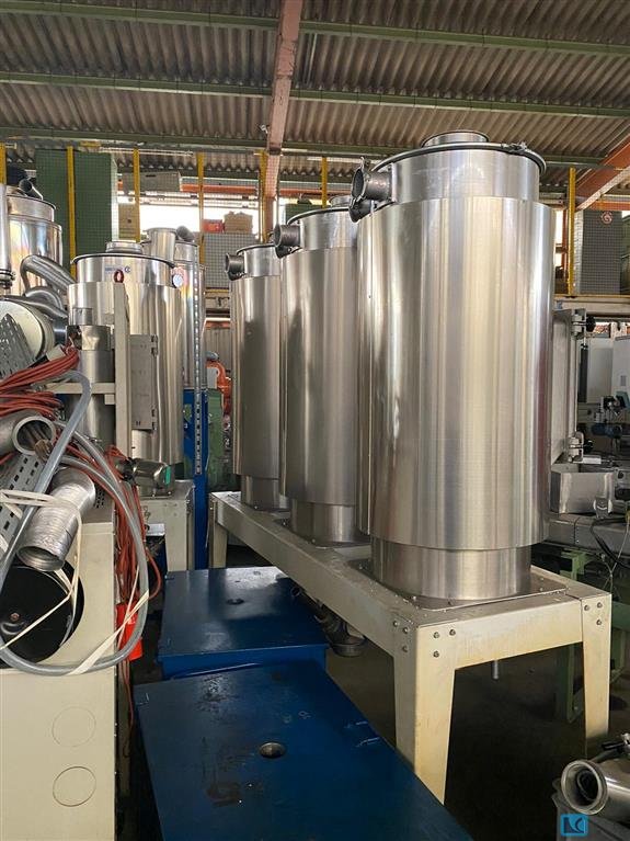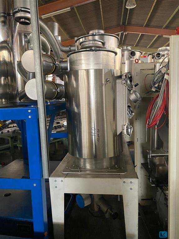 Il sistema di essiccazione/trasporto per materie plastiche - Koch CKT300 Anno di costruzione 2007 Descrizione: Impianto di essiccazione plastica con 2 silos indipendenti Generatore di aria calda con setaccio molecolare raddoppiato I setacci lavorano alternativamente, durante il processo di essiccazione, un setaccio funziona e il secondo setaccio si rigenera I silos sono isolati ermeticamente, ogni silo da 250 litri, con un proprio sistema di controllo I silos possono lavorare separatamente e indipendentemente con materiali e temperature diverse Il silo ha la funzione di riscaldamento e la funzione di mantenimento della temperatura I silos sono dotati di valvole per il collegamento di uno scivolo per detriti automatico o manuale E' possibile collegare altri 2 silos E' possibile acquistare trasportatori automatici ad aspirazione Tutte le periferiche offerte vengono avvi ...