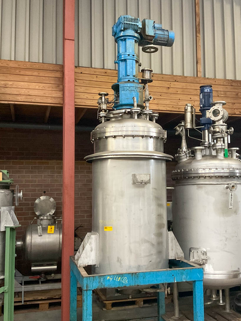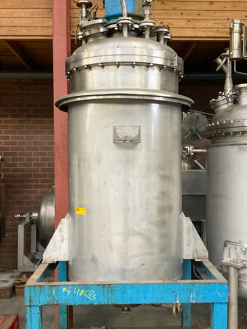 General SKU119S540 MakeJongia TypeLKP-40 No.87146 Year of construction1987 Mounted on legscheck Pressure Working pressure3 Bar Vacuum possiblecheck Working pressure jacket4.5 Bar Main Features MaterialStainless steel Volume650 Ltr. Motor1.5 KW Specified Features - Stainless Steel Reactor Reactorcheck Capacity650 Ltr Vessel sizesdia. 900x1000mm Dished bottomcheck Dished top sidecheck Manholedia. 200mm Top connectionscheck Outletcheck With jacketcheck Max. temperature100°C With paddle stirrercheck Motor1,5 KW, 220/380-420 Volt Speed mixing shaft39-253 Rpm Stainless Steel Reactors MaterialStainless steel 1.4401 (316) Information LocationBarneveld Floorspace1,5x1,3 m Total height2,6 mPlastic & polymersCatalysts & fillersStainless Steel ReactorsSolventsDetergent & surf.Other pharmaceuticsCosmeticsOrganicsLubricants & oleoSolid pharmaceuticsDyes & pigmentsAP ...