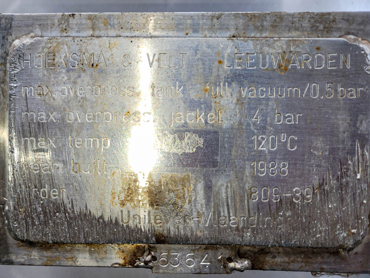 General SKU064Y441 MakeHoeksma & Velt Leeuwarden No.12150 V-310 Year of construction1990 LocationBarneveld Pressure Working pressure0.5 Bar Working pressure jacket4 Bar Vacuum possible jacketcheck Main Features MaterialStainless steel Volume800 Ltr. Motor1.5 KW Specified Features - Stainless Steel Reactor Reactor(1x) Capacity800 Ltr Vessel sizesdia. 850x1250mm Dished bottomcheck Dished top sidecheck Top connectionsdia. 150mm + dia. 125mm + 6x dia. 50mm Outletdia. 80/40mm With jacket(lower part of vessel) Max. temperature100/200 Degr. C. (vessel/jacket) With paddle stirrermake Jongia, type LM-40 Motor1,5 KW, 380 Volt Speed mixing shaft± 25-164 Rpm Stainless Steel Reactors MaterialStainless steel 1.4404 (316L) Information Floorspace1,4x1,4 M Total height2,5 MPlastic & polymersCatalysts & fillersStainless Steel ReactorsSolventsDiscountDetergent & surf.Other ...