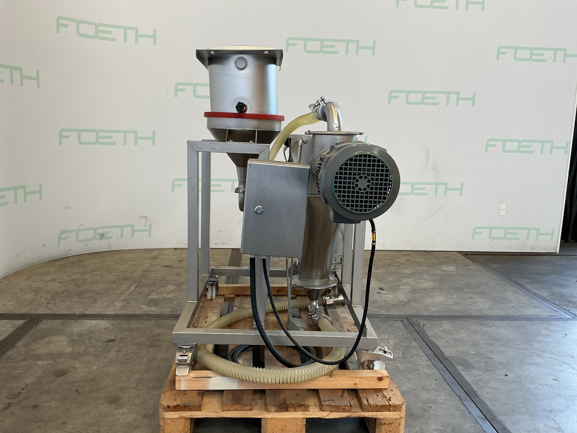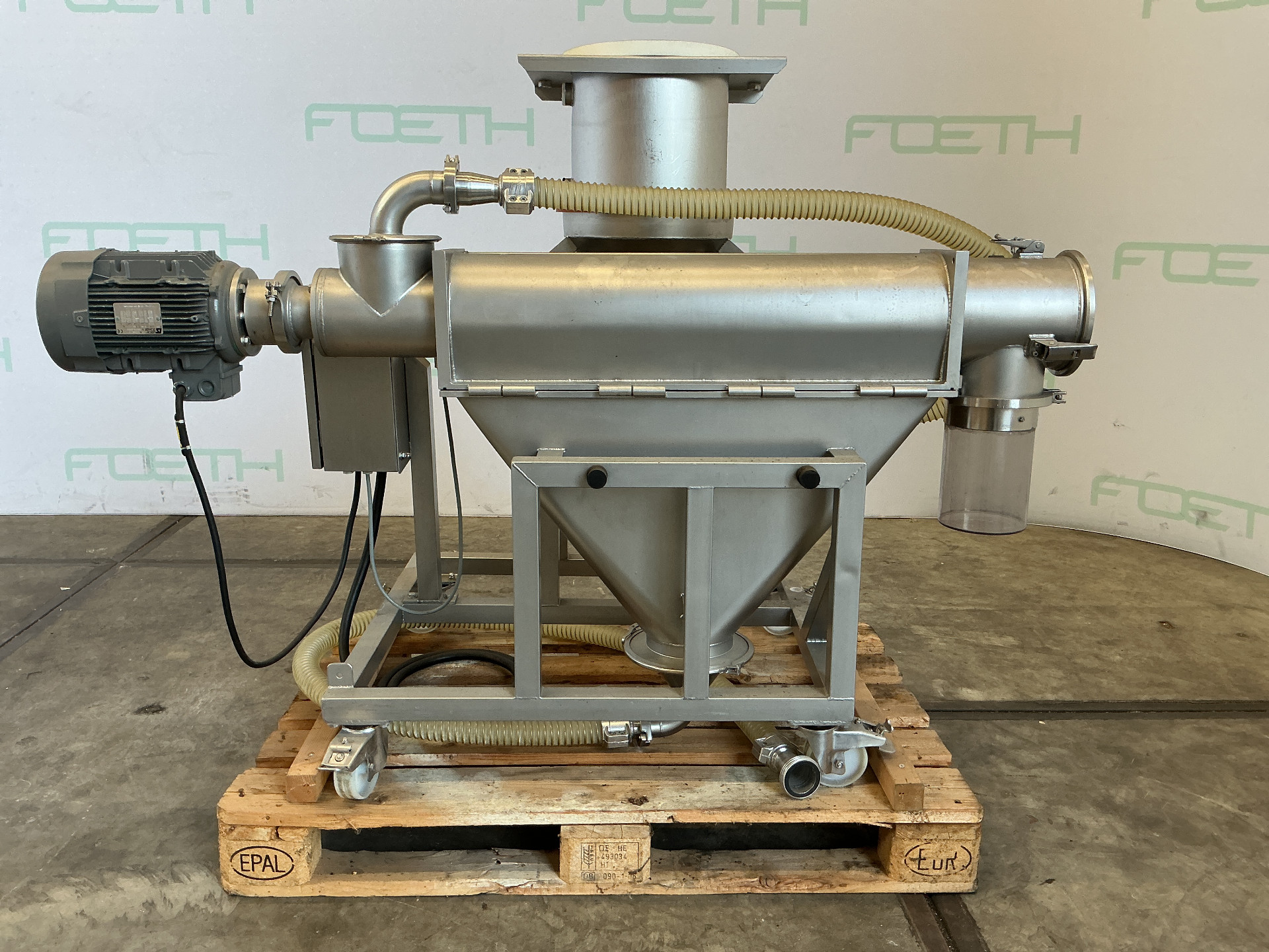 General SKU012F080 MakeCeram S.A. Saint-Cannat France TypeTS-4 Centrifugal sifter Year of construction1998 LocationBarneveld Main Features MaterialStainless steel Motor0.75 KW Length750 mm Specified Features - Rotating sieve Rotating sieve(1x) Sieve sizesdia. 135x750mm Inletdia. 45mm Outletfijn dia. 35mm, Uitlaat grof dia. 140mm Motor0,75 kW (380 V, 655 rpm) Speed655 Rpm With sieve cagecheck Sieve perforation± 5x5mm MaterialStainless steel 1.4306 (304L) Information Mounted on stainl. st. framecheck Mounted on wheelscheck Floor space1,7 x 0,8 m Total height1,2 m Weight250 kgRotating sievesDiscountCeram FranceSieves > Rotating sievesDiscountBrand > Ceram France What you can expect from Foeth: -- Machine is in working condition -- At a reduced price compared to new -- Ready for shipping to any destination worldwide -- You are welcome to inspect the machine in Barn ...