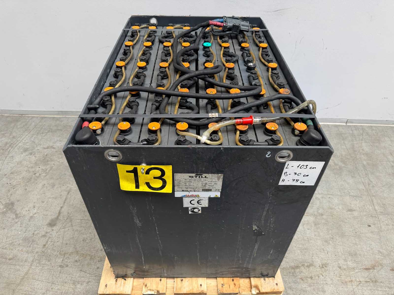 Batteria del precedente servizio Linde 830x730x630mm Tensione in modalità idle non carica 51,90 V e quindi ancora molto buona. Caricamento su camion con carrelli elevatori. Consegna tramite spedizioniere possibile su richiesta. Auction-ID: A1-45449-1123