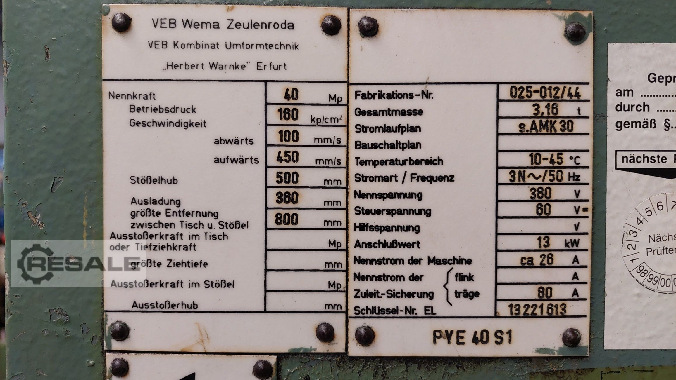 Viene venduta una pressa a gradini "Raster Zeulenroda" (oggi Zeulenroda Presstechnik) "Paust 16.2" con forza di stampa da 160 kN. La macchina è stata completamente revisionata nel 2006 ed è stata utilizzata in 1-3 turni da allora. Una visita è possibile dal lunedì al venerdì.